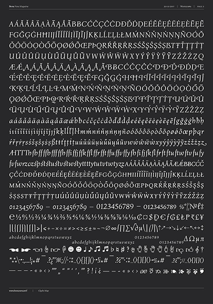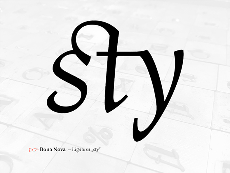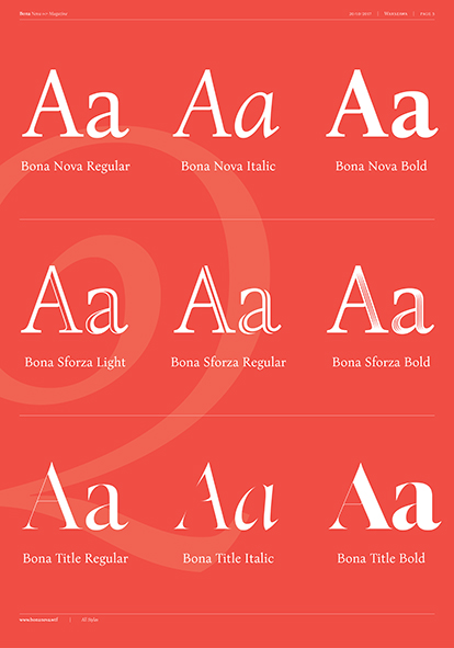“In the beginning Bona Nova typeface project aimed simply to digitize the cursive style, designed originally by Andrzej Heidrich. A voice came up that in that form it will be difficult to find application for the design in common design, forcing just the display usage. This is why I gathered tons of Andrzej Heidrich lettering examples. I tried to find characteristic solutions, that would be a starting point to draw an upright version of Bona. Heidrich has his own unforgeable style, with classical proportions, limited details and subtle contrast. After preparing a complete set of upright characters I began working on the bold version. Bona is inspired by the Italian renaissance Antiqua, which is why the newly created bold version is just slightly thicker than the regular. When I finished working on the text styles I felt that something more decorative is still missing. This is how an idea for designing contour styles – Bona Sforza came to life. Bona Title set is a supplement to the family and those styles are meant for display and titling purposes. The complete Bona Nova family consists of nine fonts that allow a versatile application”.