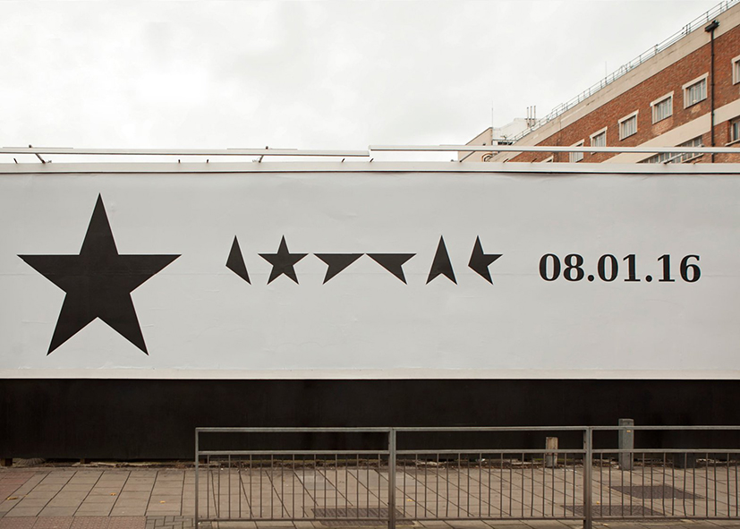 Blackstar, represented by a ★ symbol, was released on 8 January 2016 – Bowie's 69th birthday. The musician died two days later, and the album has since been interpreted as a poignant farewell and has topped charts worldwide. The album artwork was one of five that Barnbrook worked on with Bowie in the last 15 years, making the British designer one of the star's closest and longest-serving collaborators.