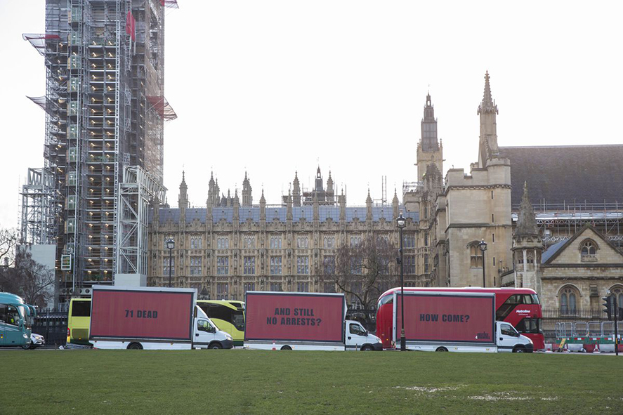 In Britain advocacy group Justice4Grenfell partnered up with BBH Labs to deploy a similar billboard campaign outside Grenfell Towers in London, where a massive fire ripped through a 24-story block of public housing flats on June 14, killing 71 people.