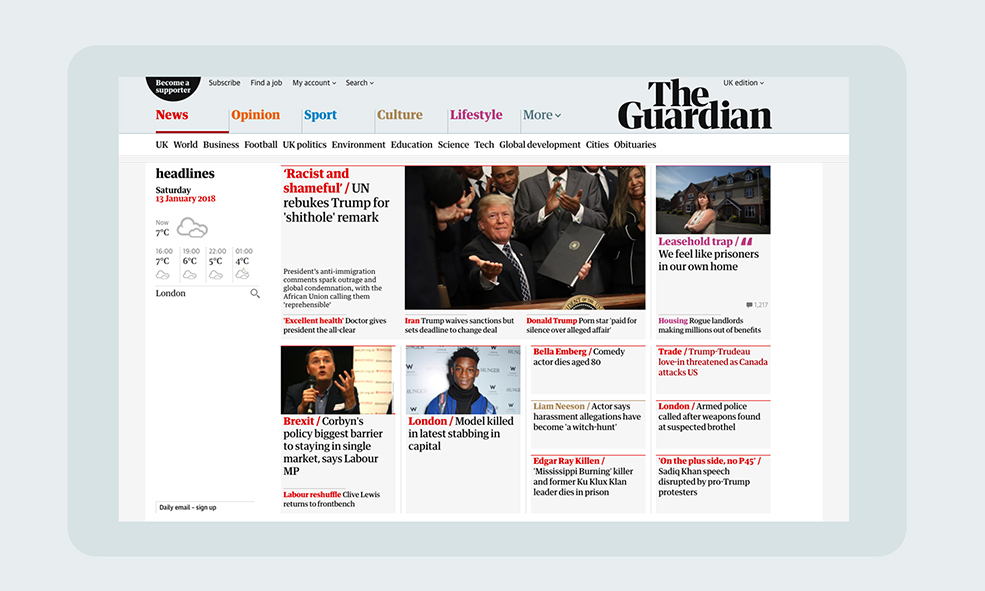 The redesign features a new font and logo designed by New York- and London-based studio Commercial Type, which also created the original Guardian Egyptian font. Guardian Headline is designed to be easier to read and is described by Viner as simple, confident and impactful “We’re using a range of energetic colours, and the much-loved Guardian visual wit and style remain at the heart of the look" she adds.