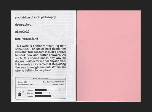 “I was trying to get a sense of my own interpretation of its ideas, and then came upon the concept of Enchiridion – a small book containing condensed information on a subject – and it kinda became obvious I had to make my own” says Oslo-based design student Simen Royseland on his inspiration for his latest project, a zine called Enchiridion, inspired by the ancient Greek philosophy Stoicism.