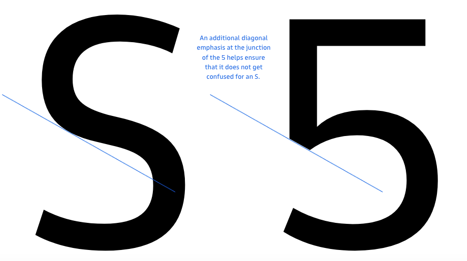 The numbers were designed to “balance harmoniously with the alphabetic design language, helping to maintain their performance as a system in their own right. Careful attention was given to help ensure distinction between commonly confused shapes.”