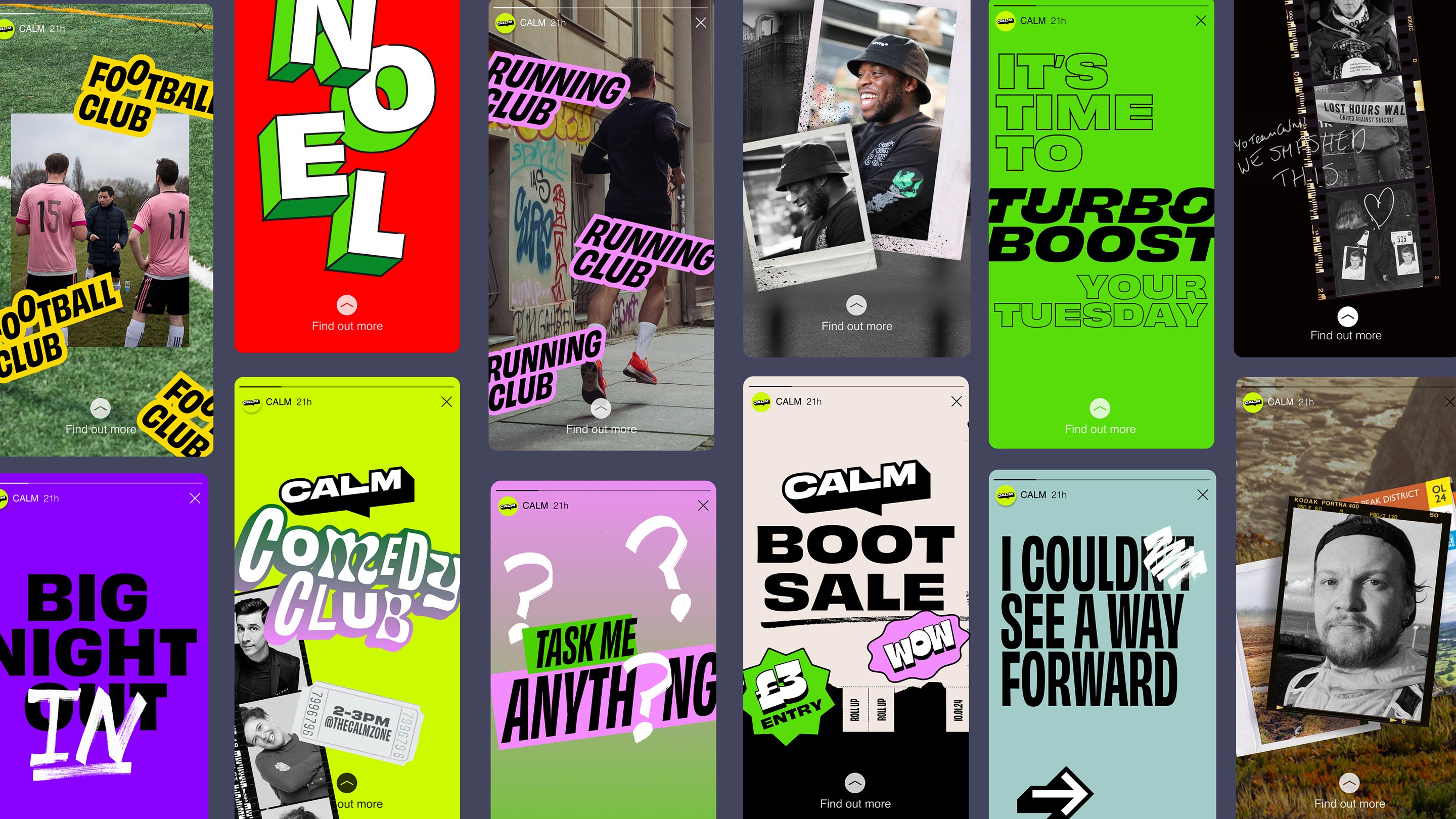 "CALM is a helpline and webchat, an online resource, content creator and campaigner. Its people spark change, give advice, start conversations, organise events and build communities. Our goal was to create a visual and verbal identity system with enough flexibility to cover it all. A brand that can fight for change and make you laugh, help someone in crisis and support anyone struggling with life.