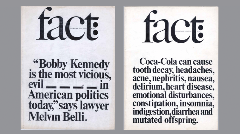 Their next project was Fact, a political journal with a muckraking bent, published between January 1964 and August 1967. Fact cost him another lawsuit after he published a special issue claiming that Senator Barry Goldwater, the Republican presidential candidate that year, was psychologically unfit for the office. He lost the lawsuit again and had to pay $1 in compensatory damages and $75,000 in punitive damages to Goldwater.